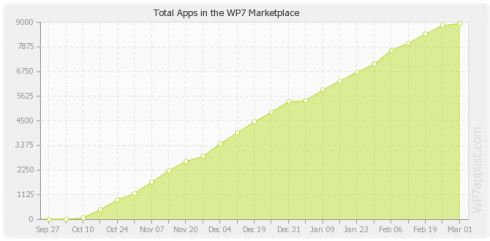 Encore une fois, ces statistiques devraient largement évoluer avec l’arrivée des premiers smartphones Windows Phone 7 de Nokia. De même que le nombre d’applications Windows Phone 7 dont la croissance devrait logiquement s’accélérer!